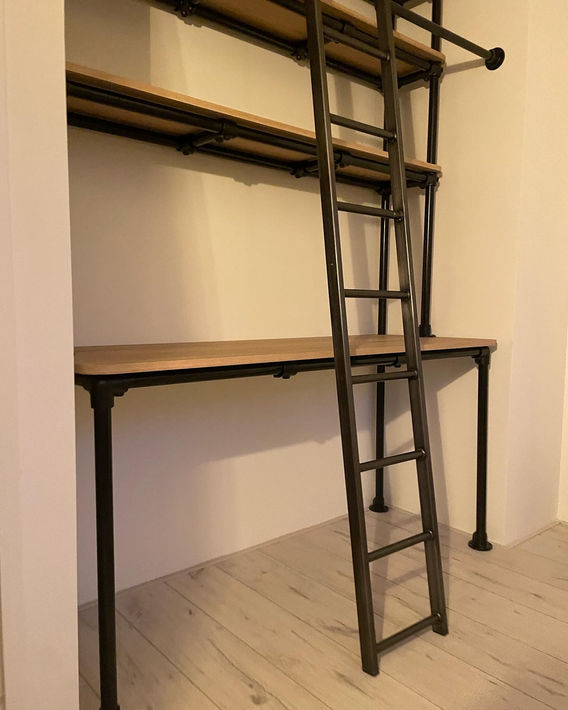Inbouwkast/bureau gemaakt van stijgerpijp en eikenfineer. Gemaakt in een hele hoge nis, waar je verder niet zoveel mee zou kunnen vanwege die hoogte in combinatie met de schuinte van het dak.. Net als alle andere maatwerkkasten gemaakt naar de wens van, en in overleg met de klant.