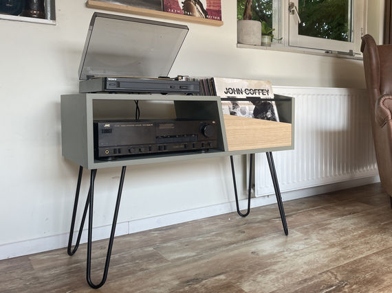 Prachtig tweekleurig LP meubel voor vinyl, versterker en platenspeler met een uniek design. Met de platenbak is het lekker browsen door (een selectie van) je collectie, en vooraan heb je gelijk een plaat mooi op display staan.