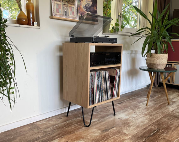 Mooi rechttoe-rechtaan eikenhouten meubel met een simpel en praktisch design speciaal gemaakt voor je platenspeler, versterker en vinyl. In het meubel is ruimte voor zo’n 85 platen en de hairpin-poten geven het meubel de retro-uitstraling die passen het draaien van lp’s.